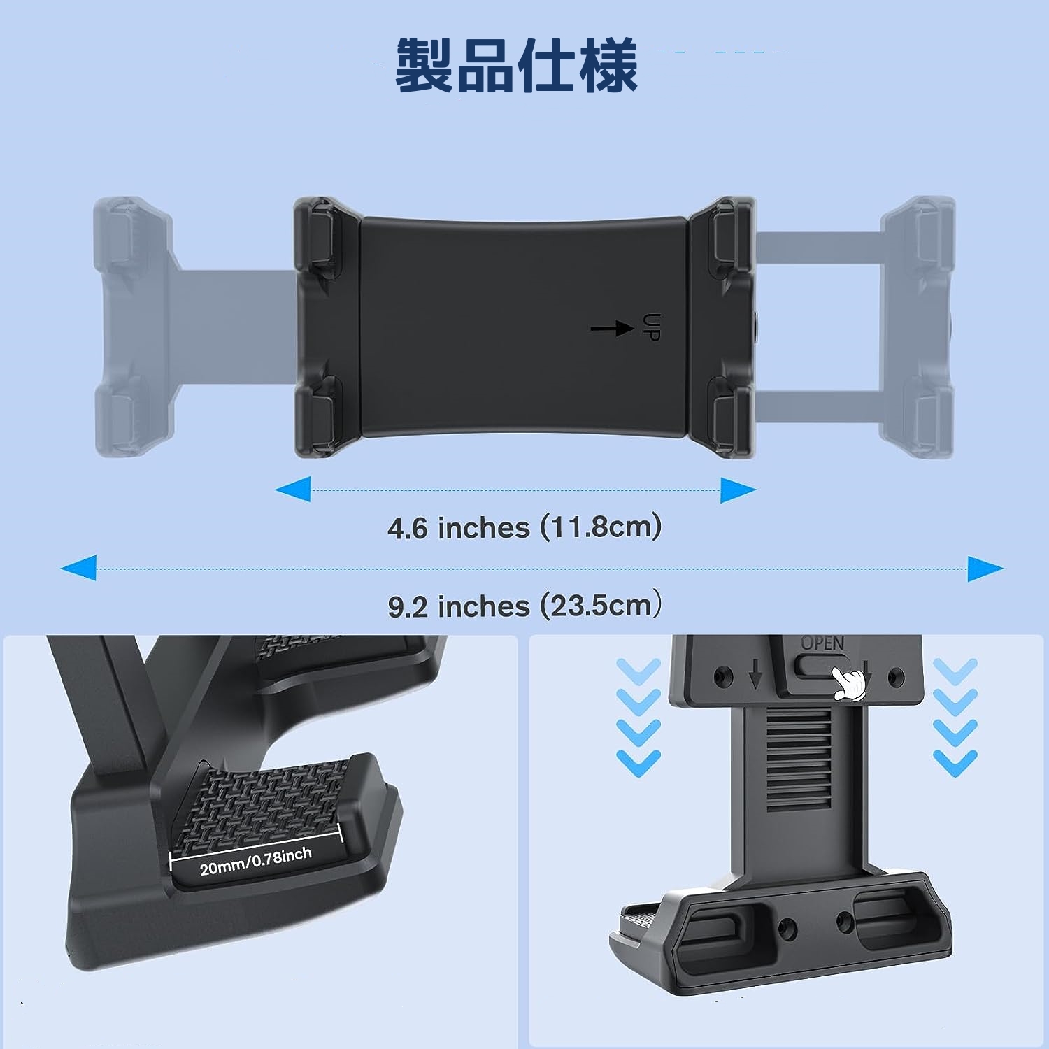 - 【ユニークなアーム設計】アーム両端の接続部はボールジョイント設計を採用しているため、アームもタブレットを挟む部分も360°回転できます。(アームの長さは9.4CM)視野に邪魔しない角度を調整できます。運転中の安定性を向上!
